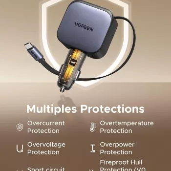 90W Retractable USB-C Car Charger 3-in-1 Fast Charging Adapter for Phones, Earbuds, and More