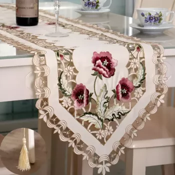 Rustic Floral Embroidered Table Runner with Tassels – Pink & Red Elegance